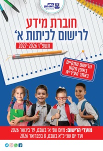 בס”ד חייבי רישום לכיתות א': לבין ט"ז בטבת 1/1/20 ילדים שנולדו בתקופה שבין ד' בטבת התש"פ .31/12/20 התשפ"א מועדי הרישום: )2026 בינואר 19 מיום שני א' בשבט התשפ"ו ( 3,4,5 לגילי )2026 בפברואר 08 עד יום ראשון כ"א בשבט התשפ"ו ( במידה ותבצעו רישום שלא במועד על פי התאריכים הרשמיים, שיבוץ * ילדכם ייעשה על בסיס מקום פנוי. חובת הרישום לגני הילדים וחובת ואילך. 3 הביקור הסדיר במסגרות חינוך חלה על ילדים מגיל המסמכים הדרושים: יש להביא תעודת זהות של שני בני הזוג בהן מופיעה כתובת ההורים ומספר ת"ז של הילד/ה. רישום באמצעות האינטרנט: www.rosh-haayin.muni.il יש לבחור עבור תורני מוכש"ר (מוכר שאינו רשמי) ולצרף את נספח ד' מהבעלות. 64 2027-2026 חוברת רישום לכיתות א’ לשנת הלימודים תשפ"ז לשנה”ל תשפ”ז רישום לבתי הספר של החינוך התורני